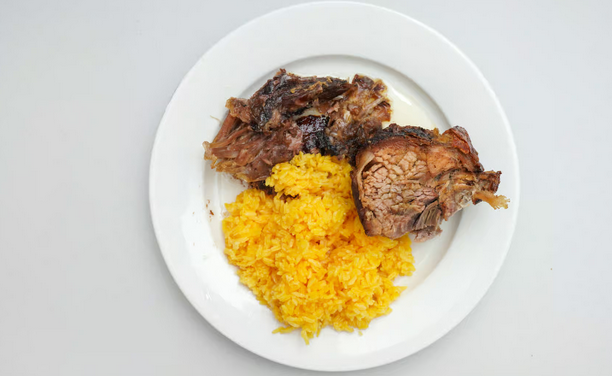 Served with choice of peas and rice or white rice, meat, or soya, and 2 vegetables. Macaroni pie, coo-coo and provision only dinners are available at additional cost. Vegetarian meal is served with choice of white rice or rice and peas and vegetables.